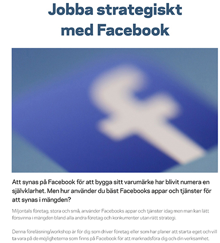 Passa på att anmäla dig redan nu till denna föreläsning/workshop om hur man kan använda Facebook. Speciellt viktigt nu när Facebook ändrar i sina algoritmer för hur kopplingar görs.